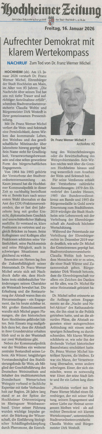 Auf der Webseite der Stadt Hochheim, unter der Rubrik Aktuelles gibt es einen der Bericht zur Jubiläumsveranstaltung. In der Hochheimer Zeitung ist dieser Bericht auch abgedruckt. Dieser Artikel ist jedoch nur eine gekürzte Fassung: